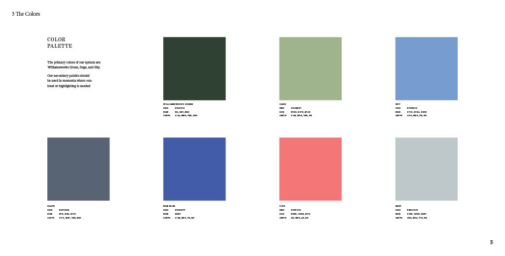 To immerse myself in williamsworks' identity, I examined their current style guide, which includes typography, color, and imagery. This will enable me to make usability changes while maintaining their aesthetic.